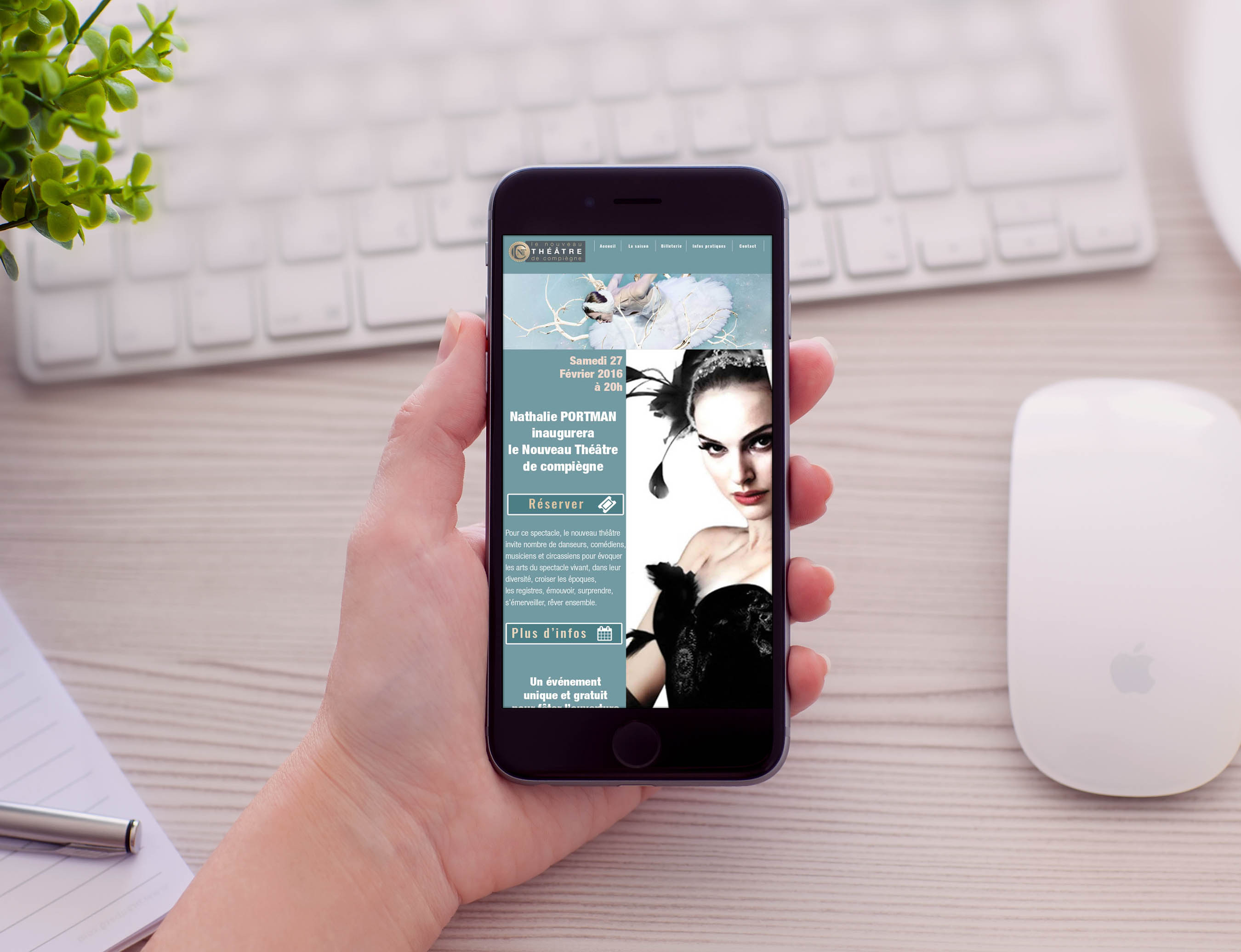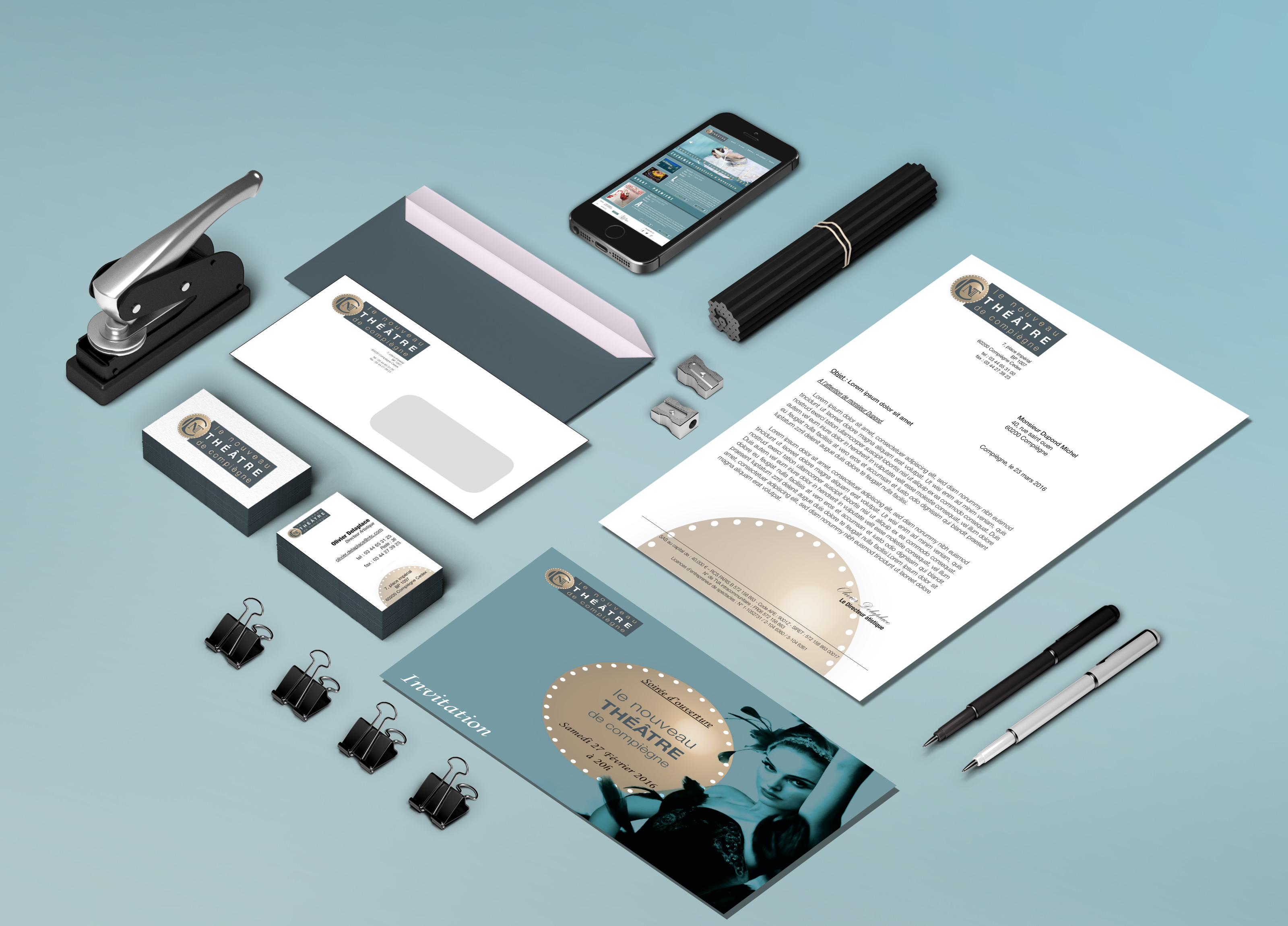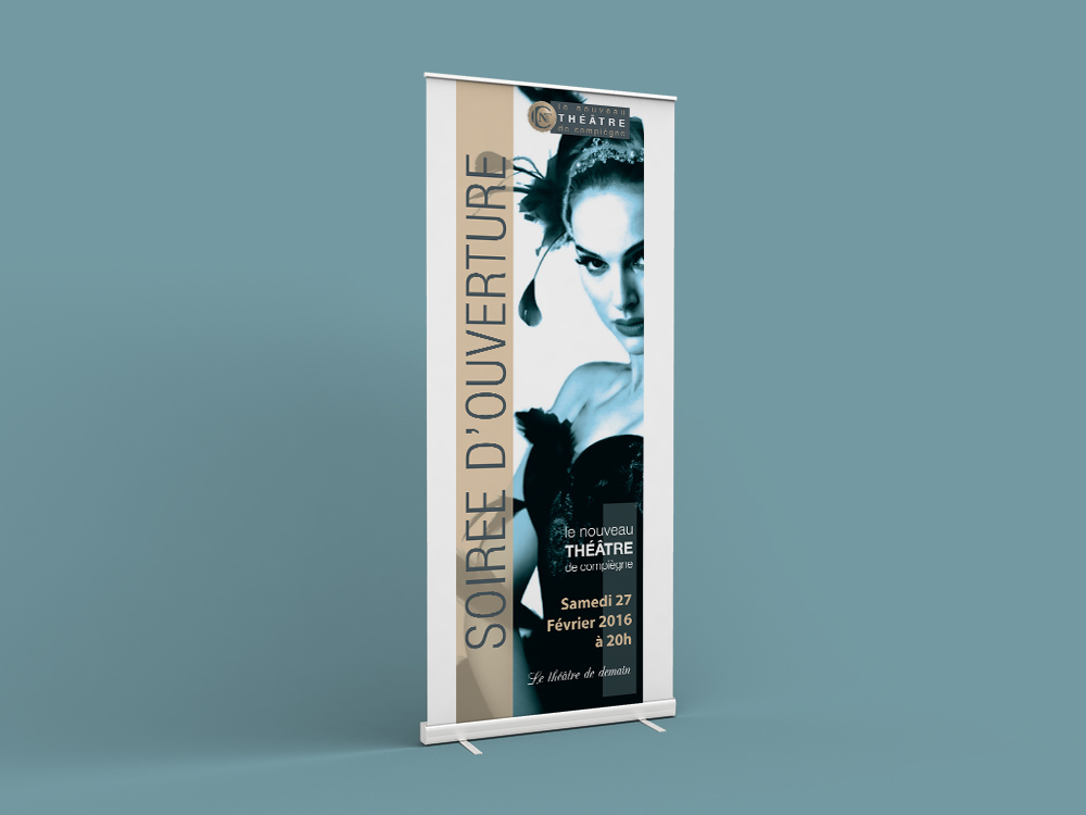Projet fictif pour le nouveau Théâtre de Compiègne création d'un Site internet, Newletter, d'un Logo, de la papeterie (carte de visite, courrier à en-tête, enveloppe...), Charte graphique, Affiche, kakemonos, Livret de programmation, etc.